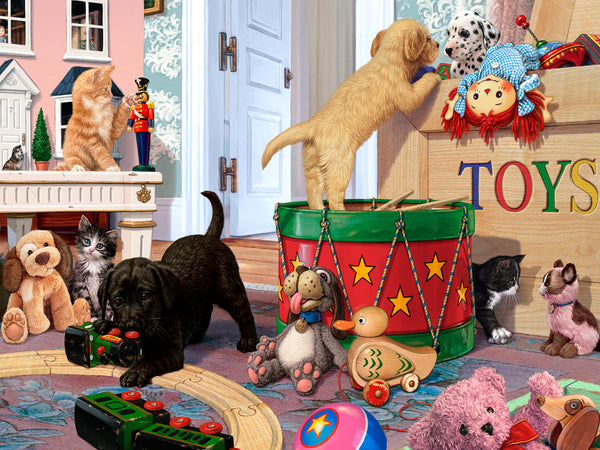 Des chiots et des chatons ayant leur temps de jeu dans la salle de jeux.