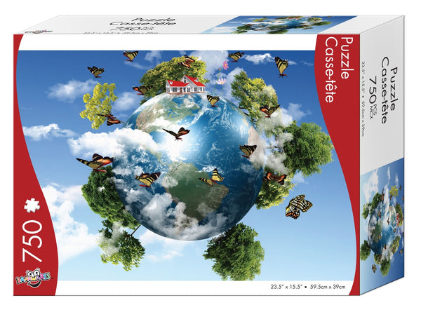 Une photo de la terre dans le ciel montrant des arbres, des papillons, des nuages ​​et une maison.