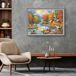 Un automne incroyablement animé dans ce camping confortable. Ce paysage d'automne est inhabituellement brillant et optimiste, représente une rivière forestière saturée de couleur bleue et de la lumière du soleil réfléchie en or et de merveilleux arbres en décoration d'automne. Vous pouvez profiter du paysage d'une cabine près de la rivière et de la faune.