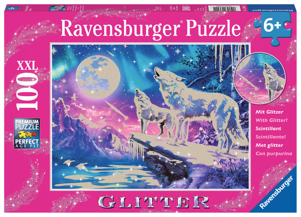Assemblez 100 pièces pour révéler une scène glacée de loups hurlants et de lumières du nord, entièrement recouverts de paillettes.