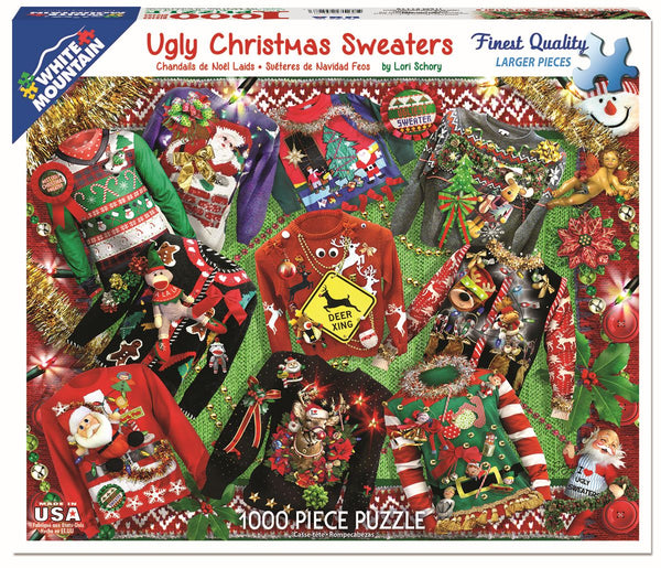 L'artiste Lori Schory a certainement un œil pour le laid! Baubles et bracelets, paillettes et étincelles, guirlandes et jouets ainsi que Santas, Reindeers, Elfes, Holly, Gingerbread, Angels & Poinsettias Décorez ce mélange de tricots et de Purls juste à temps pour votre vilain chandail de Noël. 1 000 pièces.