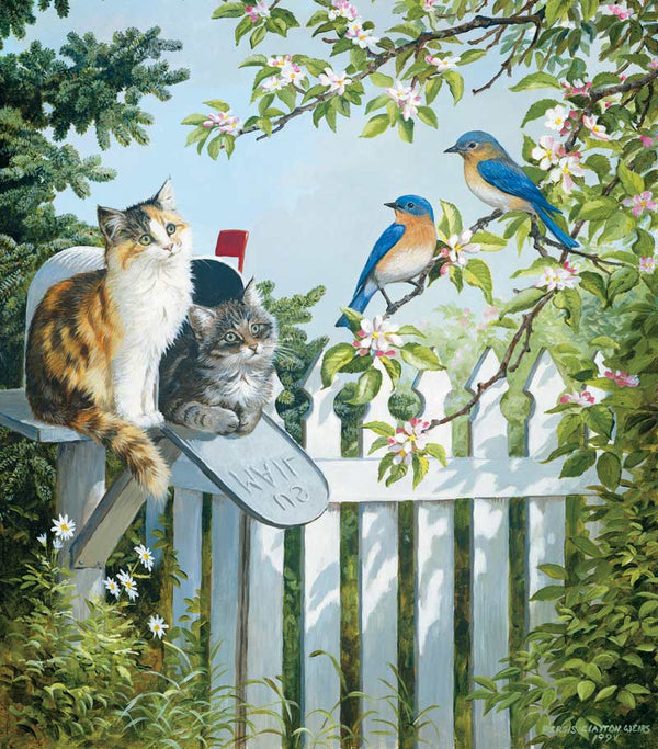 Deux chats par la boîte aux lettres qui regardent les oiseaux.