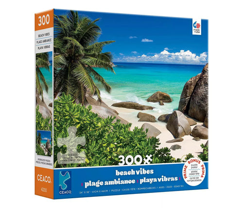 Ce puzzle de 300 pièces présente une scène côtière dans les îles Seychelles. C'est une photographie d'un palmier et des rochers menant à la plage.