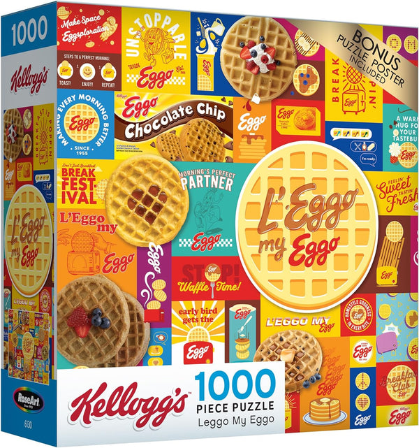 Enjoy a fun and challenging experience with the Kellogg's "Leggo My Eggo" 1000-piece jigsaw puzzle. Featuring the iconic Eggo waffles, this puzzle brings together vibrant imagery and nostalgic Kellogg's branding...