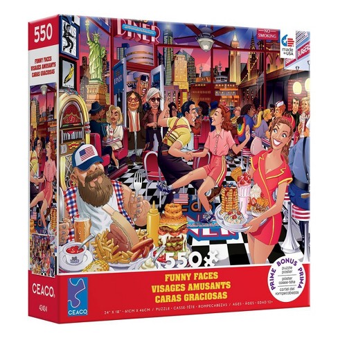 Ce puzzle de 550 pièces présente une illustration de dessins animés, dessiné dans un style de caricature, d'un restaurant de ville avec des gens dansant dans un juke-box et en...