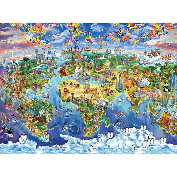 Une carte du monde unique et détaillée avec des illustrations spécifiques aux attractions de la région.