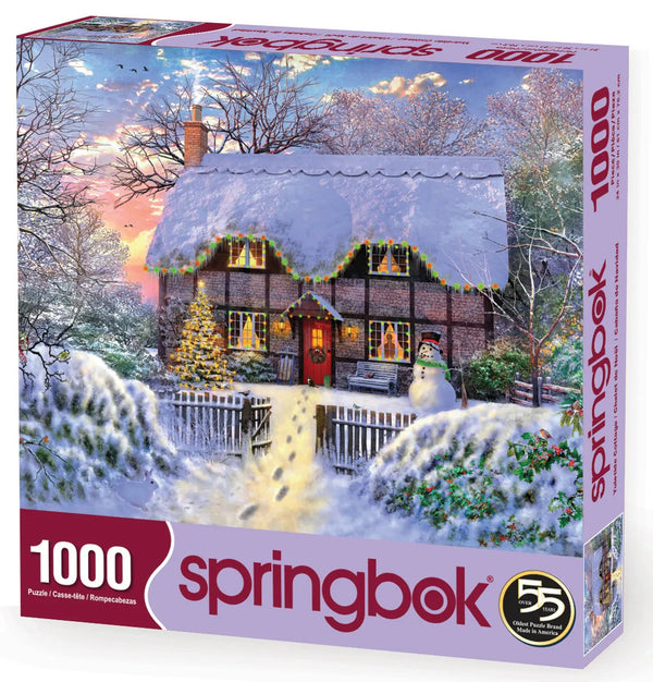 Venez à "Yuletide Cottage" et confortable! Ce puzzle de 1 000 pièces de Springbok représente un chalet de vacances plein de joie de yuletide avec une neige blanche croquante, un bonhomme de neige joyeux et une lueur chaude émettant de l'intérieur du chalet.