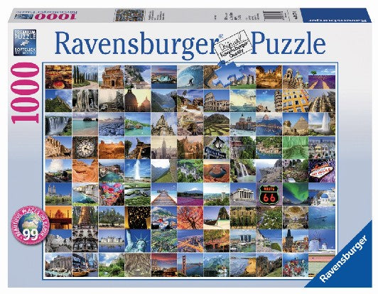 This detailed photographic montage shows an amazingly varied list of 99 of the world's most beautiful places. There are some famous buildings - St Peter's Rome, The Empire State Building and The Pyramids at Giza. Plus some remarkable natural wonders - waterfalls in Hawaii, views across Yosemite and the Sugarloaf Mountain. There are also street scenes, bridges and even some road signs. So, would you have included all of these images? Perhaps this challenging and entertaining puzzle will tempt you into creating your own top 99 places to go!