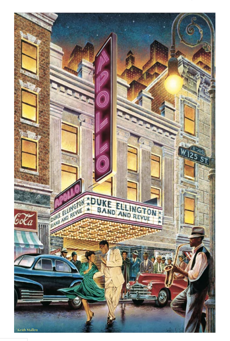 Harlem's World Famous Apollo Theater - where Stars are Born and Legends are Made! This 1930's come-to-life painting by the talented Keith Mallett features a lively couple dancing in the street in front of the theatre, with Duke Ellington on the marquis, and a jazz saxophonist in a stylish fedora leaning against a street lamp.