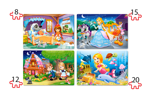 Four separate puzzles with rounded edges depicting scenes from various fairy tales. In ascending piece order, there are scenes from Little Red Riding Hood, Hansel and Gretel, Cinderella, and The Little Mermaid.