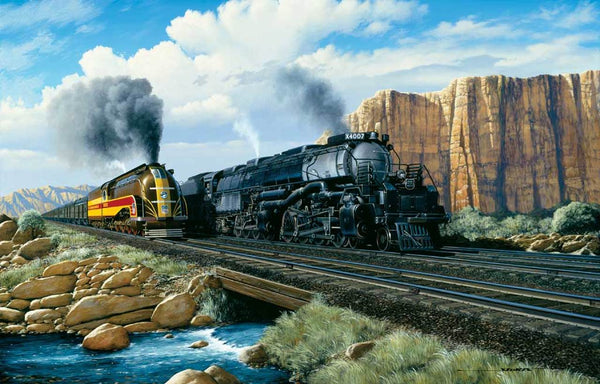 Two locomotives race side-by-side in this beautiful 1000-piece jigsaw puzzle by Sunsout. From The Stokes Collection. Finished puzzle 19"x30".