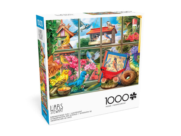 This Buffalo Games 1000-piece jigsaw puzzle, Birdwatching Fun, is based on the artwork of Lars Stewart. Outside a birdwatcher’s window is an array of colorful feathered friends enjoying the birdhouses...