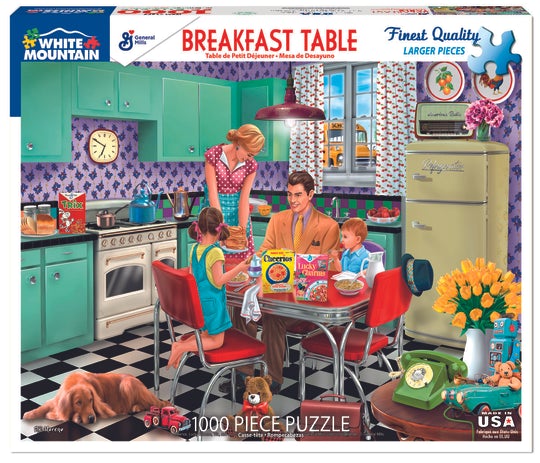 It’s a quiet start to the day. As the family dog rests on the floor beside the table, mom serves dad pancakes and the kids eat their favorite cereal. Toys strewn about signify the kids had already begun playing before they were called to eat. It’s almost 8am which means the neighborhood is awake. A school bus passes by the kitchen window but the kids in this house are still too young to attend. Dads’ briefcase is on the floor near the phone so he can grab it on the way out the door. Artist P.D. Moreno allows us to have breakfast with the family in this vintage inspired 1000-piece jigsaw puzzle.