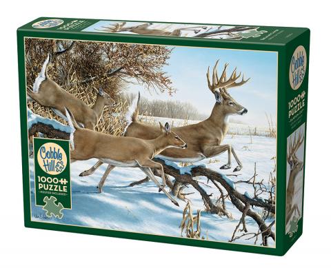 The white tailed deer are Breaking Cover as they hear the crackling of tree branches behind them. It's a tough call to run out into the open field, but they have to escape the snow covered forest before they become someone's prize for the winter. A heart pumping 1000 piece scenic wildlife puzzle.