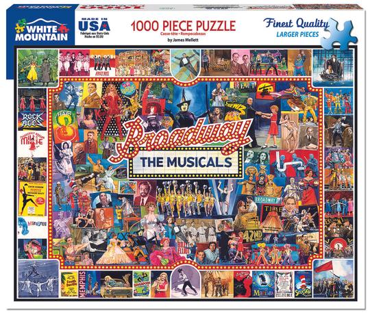 Artist Jim Mellett spent months painting this dazzling tribute to Broadway musicals. All the great shows are pictured here, including Rock of Ages, Thoroughly Modern Millie, Redhead, Hairspray, The Wiz, South Pacific, Memphis, Brigadoon, La Cage Aux Folles, Matilda, Kiss Me Kate, Seussical the Musical, Jersey Boys, Hair, Bye Bye Birdie, Billy Elliot, 42nd Street, Jesus Christ Superstar, Rent, Annie Get Your Gun, Mama Mia, Funny Girl, Camelot, Fiddler on the Roof, Cabaret, West Side Story, A Chorus Line, Oklahoma, Porgy & Bess, Phantom of the Opera, Springtime for Hitler, Godspell, Kinky Boots - and so many more for you to hum along to as you build this 1,000 piece puzzle.