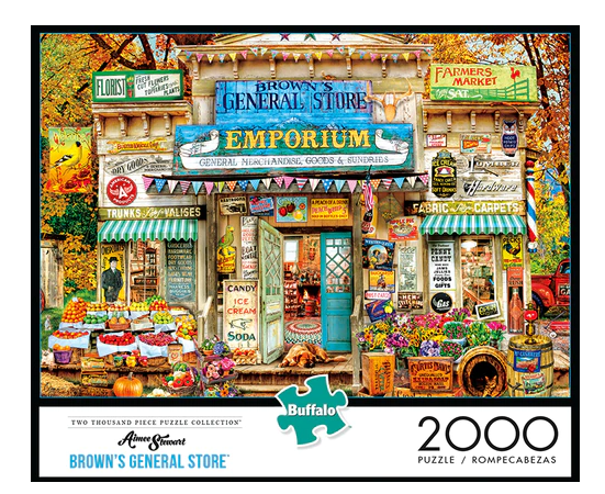 This beautiful 2000 piece puzzles is based on the artwork of Aimee Stewart. Brown’s General Store takes you back in time. Baskets of fresh fruit and flowers line the front porch...