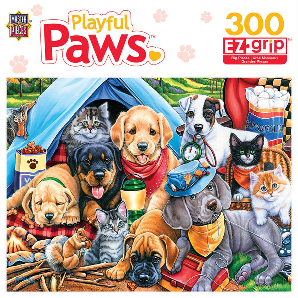 Join the camping buddies, including cats, dogs and a few unplanned guests, on a fun-filled experience camping out in nature! Collect all 4 puzzles in the "Playful Paws" series by artist Jenny Newland.