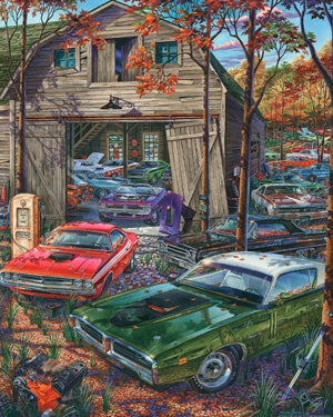 Image of a farm in a wooden area surrounded by vintage cars in various stages of repair, with more cars and spare parts seen inside the barn. Artwork by Michael...