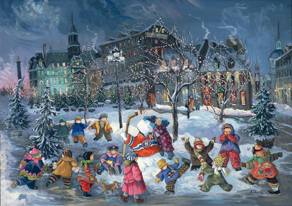 Enter a winter wonderland on the streets of historic Montreal where children are making a snowman dressed in an iconic Montreal Canadiens sweater.
