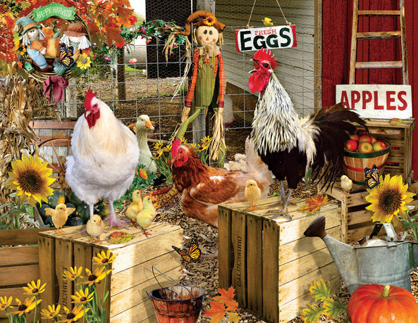 Chickens and their chicks wander the farm grounds, roosting where they please.