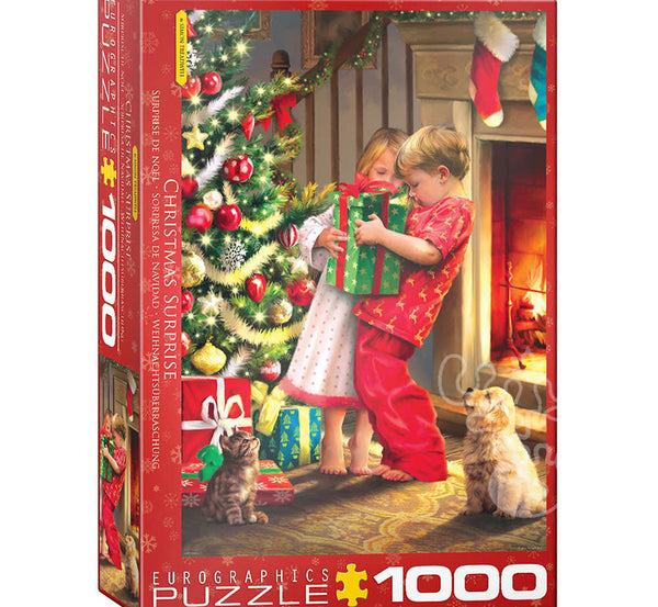 The joy of Christmas and opening gifts around the tree. Two children are eagerly anticipating what's inside the wrapped box. Have fun assembling this 1000 piece puzzle.