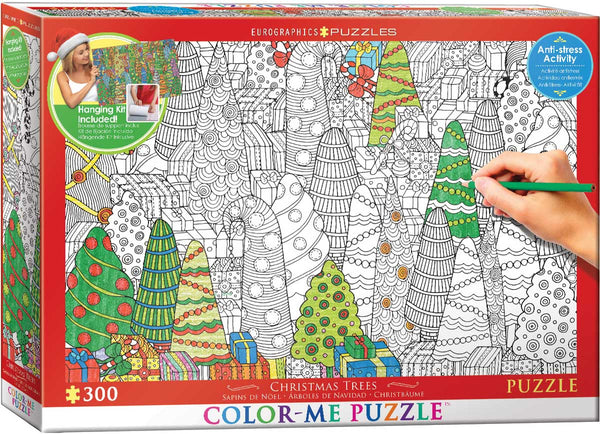 Enjoy putting together this 300 piece "color-me puzzle" of Christmas Trees. Great Anti-Stress Activity! Assemble the puzzle & color it! Hanging Kit also Included! NOTE: Colored pencils not included.