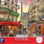 This 1000 piece puzzle by the talented artist, David Maclean, features a vibrant image of a Parisian street with the Eiffel Tower in the distance.