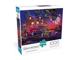 In this puzzle titled Classic Summer Night, the kids’ Fourth of July excitement has just begun. A boy is seconds away from lighting off his favorite fireworks, while his sister watches a display, just across the lake. Enjoy piecing together this puzzle, all-year round. This 1,000 piece puzzle is titled Summer Night and is based on the artwork of Geno Peoples.