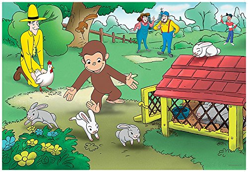 Curious George attempts to corral some rascally rabbits back home, while The Man in the Yellow Hat helps rounding up the chickens.