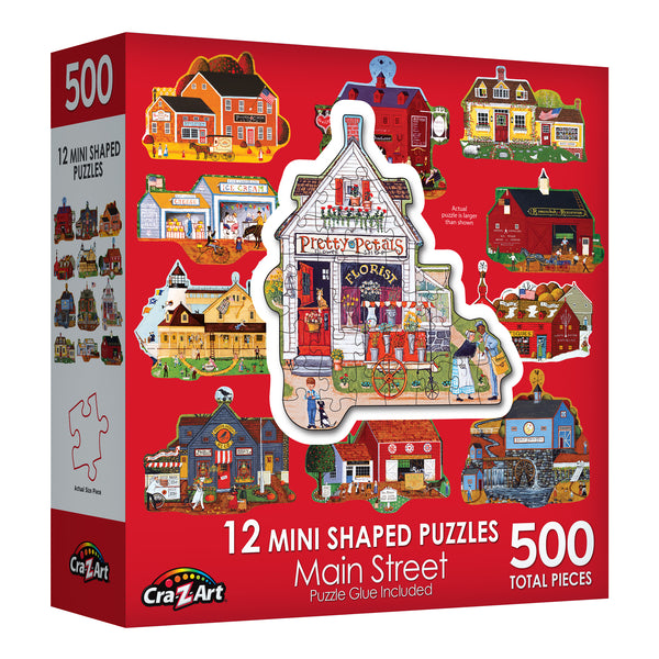RoseArt Multi-Shaped Puzzles showcasing the charming Main Street Cottages. This delightful puzzle set comprises 12 uniquely shaped puzzles, each depicting picturesque and quaint little cottages. Crafted with precision and attention to detail, these puzzles offer an immersive and enjoyable experience for puzzle enthusiasts of all ages.