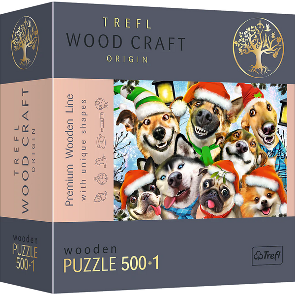 The series of 500+1 wooden puzzles is perfect for all puzzle lovers. It will allow you to create a picture measuring 37.5 x 25.4 cm depicting various dogs in a festive Christmas atmosphere. The puzzle is made of wood and the packaging is made of environmentally friendly cardboard. The puzzle contains irregular elements and 50 Christmas-themed figures.