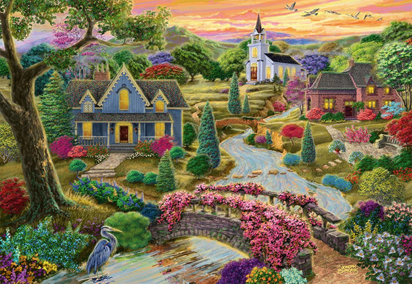 Assemble the pieces to reveal an idyllic countryside scene complete with colourful cottages, rolling hills, a white chapel, and meandering stream.