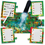 Recompose le puzzle, observe attentivement l'illustration et trouve les sujets dans la forêt. Tel un vrai scientifique, note toutes tes découvertes sur les carnets. Et grâce à la torche magique, tu peux aussi observer ce qui ne se voit pas à l'œil nu !