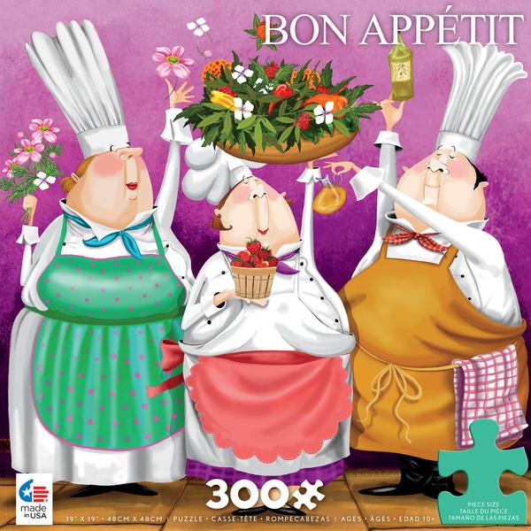 This 300 oversized piece puzzle by artist, Tracy Flickinger, depicts three chefs holding a large garden salad above their heads and the text Bon Appetit in the top corner of the image.