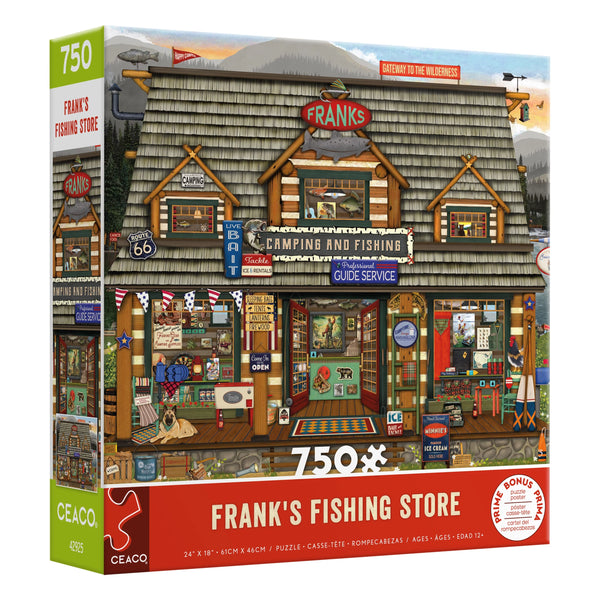 This 750 piece puzzle by illustrator Lori Nawyn features a camping and fishing store. Its packed with tons of detail in the windows and signs and features a German Shepherd and a rooster. A bonus poster is included. The puzzle's dimensions are 24 x 18.