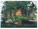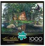 A bald eagle soars near a secluded lake-front cabin in this lovely 1000-piece jigsaw puzzle by talented artist Kim Norlien. Fine details like a rainbow in the distance, a picnic lunch,...