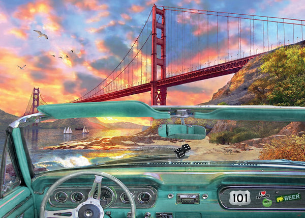 The view of the water and the Golden Gate Bridge from the front seat of a car.