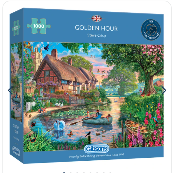 Can you think of a better way to spend a summer’s evening? As the sun sets on another gorgeous day, Rita, Luke and Layla bob along the river in their little wooden boat. This 1000 piece puzzle has been painted by the talented artist Steve Crisp.