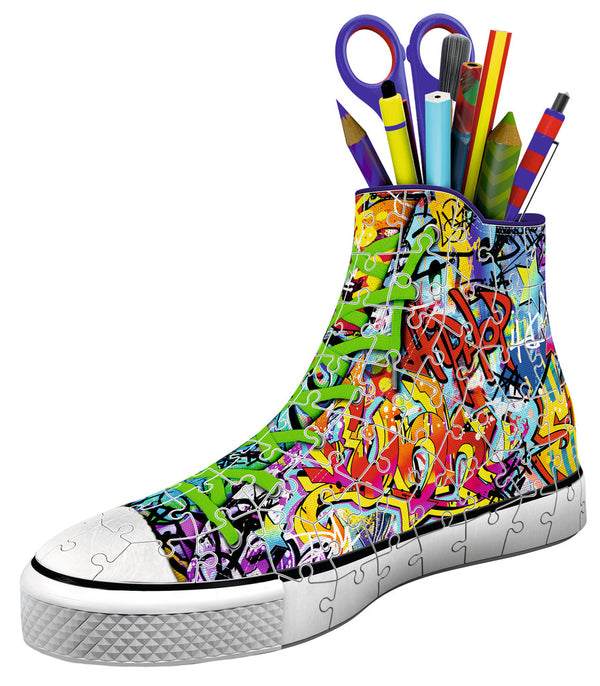 Puzzles are not limited to 2D, rebel against traditional puzzling and step into storage with this 3D sneaker puzzle from Ravensburger! Follow the numbered pieces or challenge yourself and follow the image to put together a graffiti-themed high top sneaker that doubles as a pencil holder. This classic design references a fashion staple that has lasted for generations and is the perfect fit for any puzzler ages 8 and up. Ravensburger’s 3D puzzle pieces are sturdy and interlock perfectly to create unique 3-dimensional shapes that stay together with no glue required.