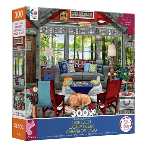 This 300 oversized piece puzzle by artist, Tracy Flickinger, depicts a lovely and rustic living room in a lake cabin with a yellow lab napping in the foreground.