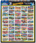 Greetings From…all fifty states in this colorful collection of stamps issued by the United States Postal Service. Bold graphics invite us to explore each state – skiing in Colorado, horse racing in Kentucky, lighthouses and moose of Maine, the golden plains of Iowa and Kansas, bronco busting in Montana, cacti and mesas of Arizona, sailing in Rhode Island, and a couple of majestic bucks in the White Mountain Puzzles home state of New Hampshire.