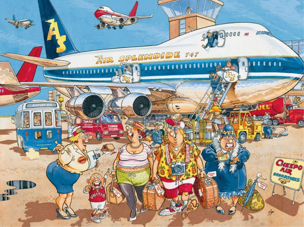Happy Holidays illustrates a family who is looking forward to getting on the plane and flying to the warm sunshine that they’ve been waiting for all year. But what could spoil their summer pleasure and get them wishing they’d not booked with ‘Cheepo Air’. What can be causing the scene on the puzzle box?