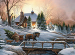 This 1000-piece holiday jigsaw puzzle titled Heading Home by famed painter Terry Redlin depicts a snowy sled ride home. A couple and their dog ride a sled across a snowy bridge while they bring home their Christmas tree. In the background there is a cozy cabin and a church surrounded by pine trees.