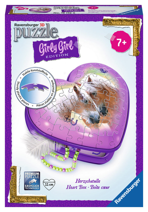 Follow the numbered pieces or challenge yourself and follow the image to put together a horse-themed heart-shaped case. This 3D Puzzle is perfect for storing notes, supplies, or jewelry!