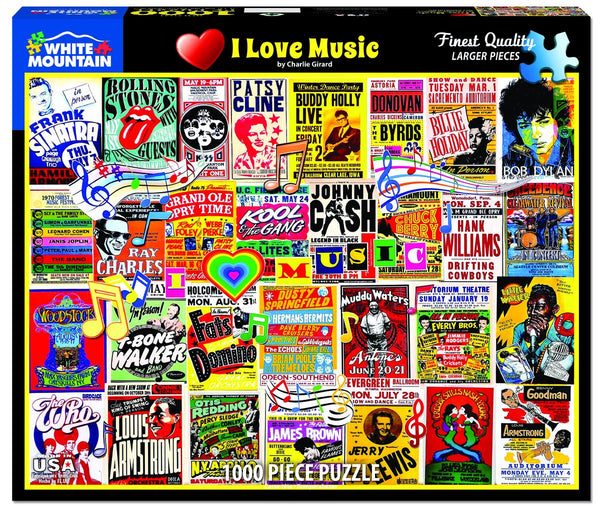 This concert poster collage designed by Artist Charlie Girard. This 1000 piece puzzle has a finished size of 24" x 30".