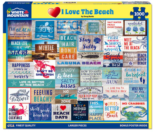 From Beach Hair Don’t Care to Salty Water Heals Everything. Artist Doug Banks gathered saying that will make beach lovers smile in this 1000 piece collage style jigsaw puzzle.
