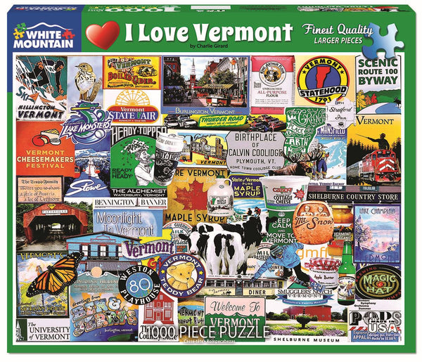 This collage features various images of local food, ski resorts and landmarks from the state of Vermont.