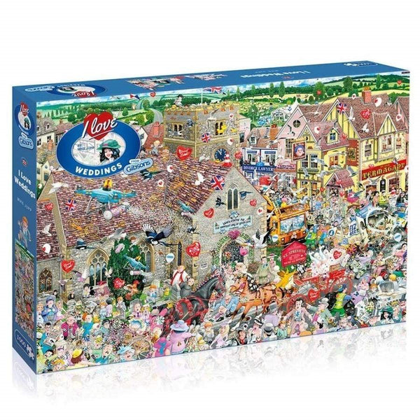 Get ready to see weddings as you have never seen them before! There is a chuckle a minute in this amazingly detailed puzzle. Britain’s premier cartoon illustrator, Mike Jupp, continues to delight jigsaw puzzle fans year after year and his ‘I Love’ range cannot fail to amuse both young and old. I Love Weddings is the latest addition to the collection and details Mike’s hilarious capacity to capture the comical and ridiculous side of everyday life. A jumble of jubilant celebration is shown in this jam-packed puzzle, where all things Wedding-like have gathered.