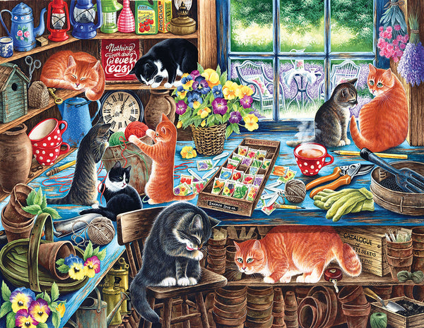 A clowder of cats takes up residence in a well-stocked garden shed.