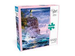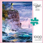 Keeping the Light is a 1,000 piece jigsaw puzzle, by artist Darrell Bush. Keep your light on at night to enjoy piecing together this beautiful puzzle. It features a lighthouse on a rocky cliff with its light shone over the choppy nighttime waters as a sailboat passes by and the waves crash against the shore.